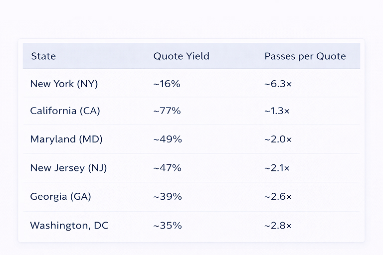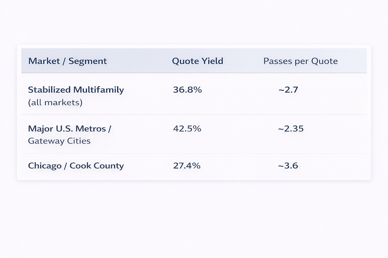 In Chicago and Cook County, lender quote yield sits near 27%, materially below the approximately 42% quote yield observed across major U.S. metro markets. This gap reflects increased underwriting friction tied to tax volatility, regulatory complexity, and longer legal timelines.